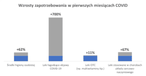 Co ciekawe ten krótkotrwały i nagły wzrost popytu dotyczył nie tylko wspomnianych płynów do dezynfekcji, ale też leków przeciwcukrzycowych, przeciwnadciśnieniowych, związanych ze zdrowiem psychicznym oraz chorobami układu oddechowego. Wiąże się to ze zmianą trendów konsumpcyjnych i preskrypcyjnych,